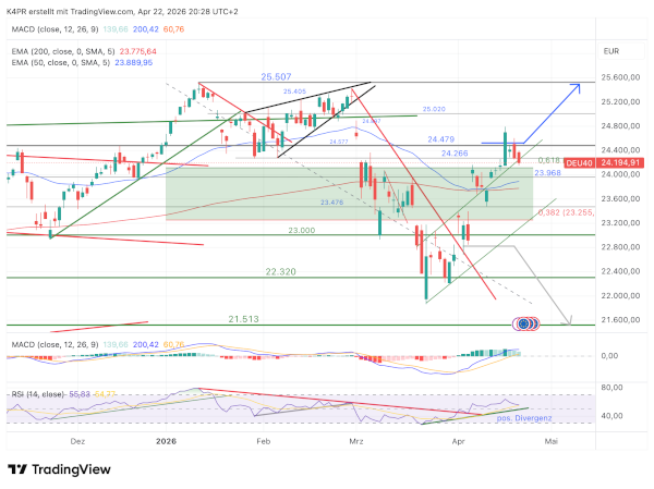 Auf der anderen Seite gibt es aber auch Risiken: Sollte der Index unter wichtige Unterstützungsmarken fallen – insbesondere, wenn der langfristige Durchschnitt bei aktuell 23.775 Punkten nach unten durchbrochen wird – könnte sich die Stimmung deutlich eintrüben. Dann wären Rückgänge in Richtung 23.480 und sogar bis auf 23.255 Punkte denkbar.