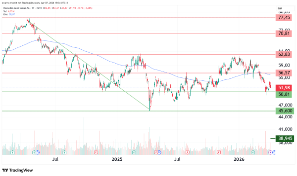 Im übergeordneten Bild hat der Kursverlauf ab Mitte April 2021 mit rund 61,58 Euro wieder das Vorkrisenniveau erreicht. Allerdings sind die vier Ausbruchsversuche seit Mitte Februar 2022 bis Anfang April 2024 auf dem Niveau von etwa 77,45 Euro gescheitert. Nach dem letzten Versuch bildete sich eine Abwärtssequenz, die bis zur Unterstützungszone bei 45,60 Euro am 7. April 2025 führte. Ursachen hierfür sind eine Gewinnwarnung, der Zollkrieg sowie eine deutliche Schwäche in China. Inzwischen hat sich der Kurs weiter eingetrübt und die Unterstützung bei 50,81 Euro getestet. Aktuell gibt es jedoch keine Anzeichen dafür, dass sich die schwierige Lage in China stabilisiert. Daher könnte der Kurs die Unterstützung bei 50,81 Euro nach unten durchbrechen. Der aktuelle Kursverlauf zeigt jedoch, dass trotz enttäuschender Absatzmeldungen der Kurs stabil bleibt. Sollten die Kriegshandlungen im Iran enden, könnte der bedeutende Widerstand bei 56,57 Euro getestet und möglicherweise überwunden werden. Die derzeitigen wirtschaftlichen Rahmenbedingungen sprechen jedoch dagegen, dass der Kurs in den kommenden Wochen auf 62,83 Euro steigt. In diesem Zeitraum könnte auch die Unterstützung bei 45,60 Euro unangetastet bleiben.