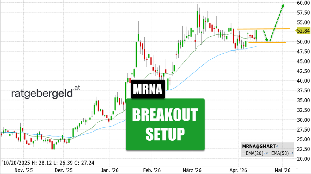 Rückblick: Die lange in der Versenkung verschwundene Moderna-Aktie ist mit einem Breakout-Setup auf die Long-Watchlist zurückgekehrt. Das Wertpapier hat seinen Kurs in den vergangenen sechs Monaten verdoppelt und befindet sich in einem Aufwärtstrend. Auch die starke Kerze vom gestrigen Dienstag sendet ein bullisches Signal.