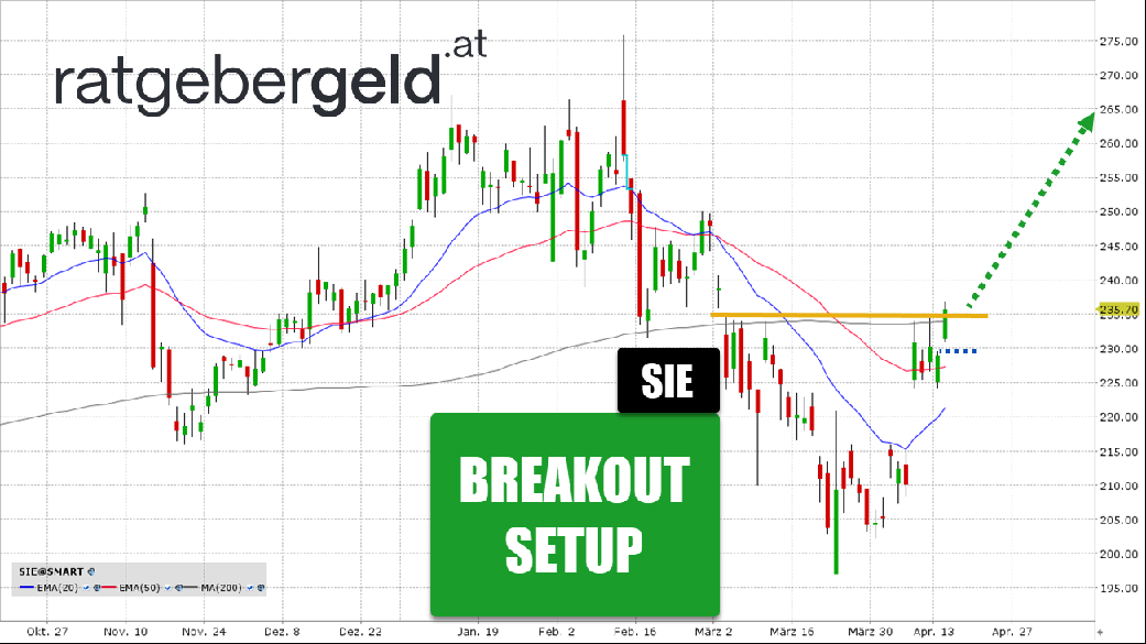 Die Aktie konnte gerade die 200-Tageline zurückerobern. Dieser Bereich fungierte in der Vergangenheit als Barriere. Wir sehen, dass der Kurs über den kurzfristigen gleitenden Durchschnitten (EMA 20/50) notiert, die nach oben drehen. Wenn die Marke von 235 Euro nachhaltig verteidigt wird, liegt das Kursziel im Bereich von 260 bis 265 Euro.