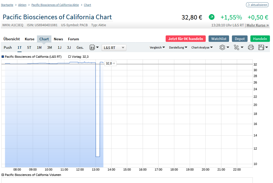 Auf anderen Börsenplätzen oder aber auch auf https://www.ls-tc.de/de/aktie/pacific-biosciences-of-california-aktie ist dies nicht zu sehen. Es handelt sich also um eine fehlerhafte Übertragung, warum auch immer.