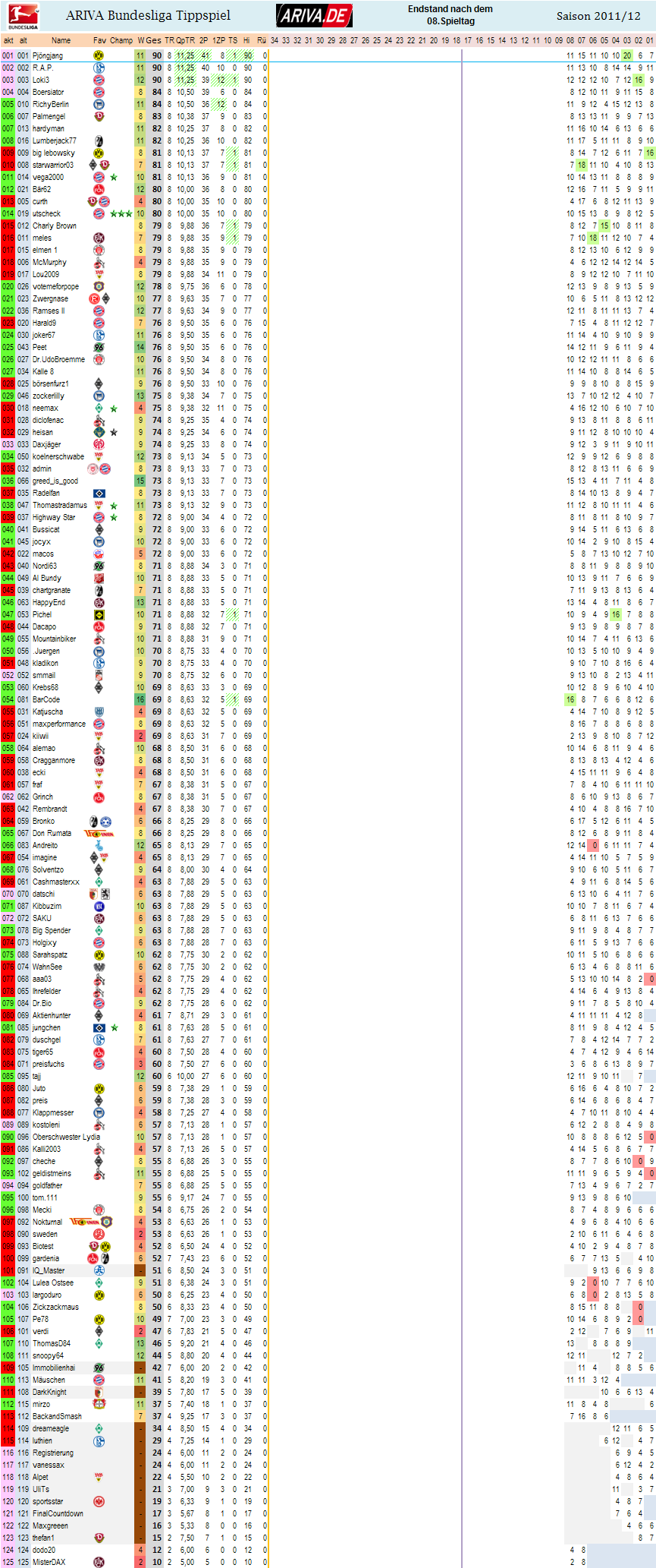 Gesamtübersicht: Stand nach dem 8.Spieltag