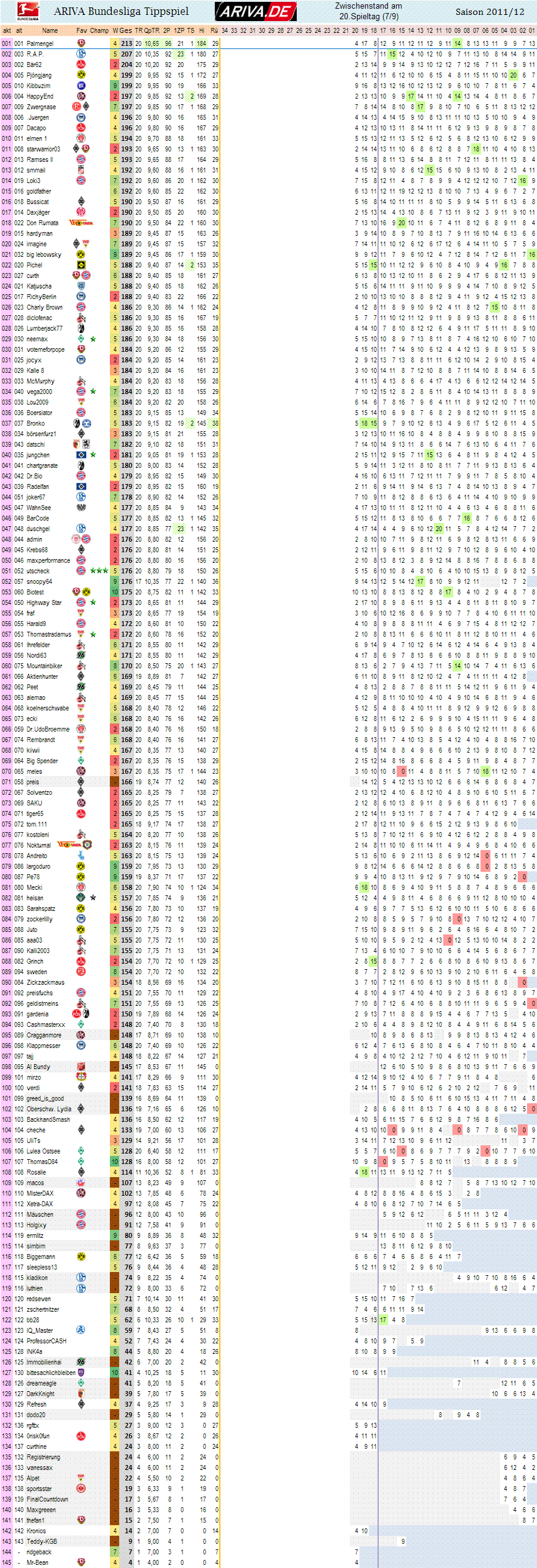 ..nun 90 Tipper "entschlüsselt" verteilt über jeweiligen Teilnahmehorizont.. wird weiterhin aktualisiert.. 10Jahre BL Spiel, dat muß brummen auf dem Rechner und Statistkihighlight werden.. ;o)) Also die nä Spieltage wirds davon sozusagen immer die jeweilige Top100 geben als übersicht der je 3 Tabellen.. 2, 3 oder 5 Jahre rückwirkend.. |
