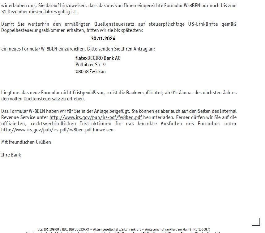 Danke für den Hinweis mit dem W8BEN. Hab meine Escrows zuletzt bei Flatex gehabt auch wenn mein Depot mit COOP seit den Gebühren umgezogen ist. Hab das Anschreiben auch gerade gesehen. Ist von Ende Sept 2024.