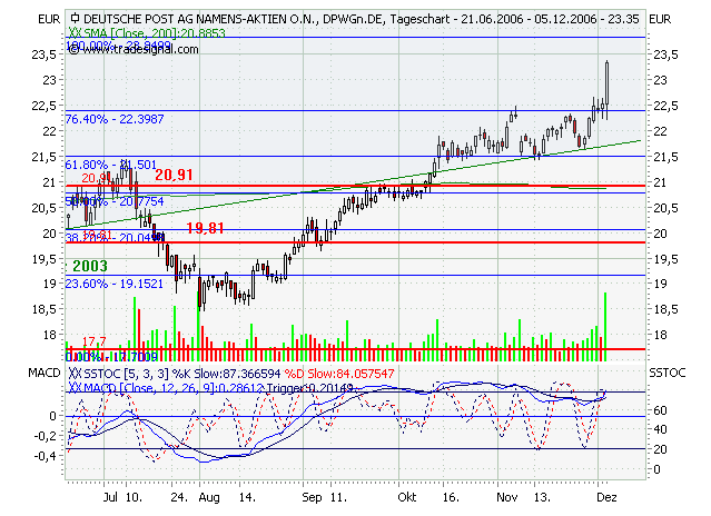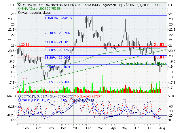 Die Deutsche Post AG strebt in ihrem Expressbereich langfristig eine deutlich höhere Rendite an als derzeit. Nach 2009 sei eine EBIT-Marge von 10% geplant, sagte Express-Finanzvorstand Oliver Gritz am Dienstag auf einer im Internet übertragenen Analystenkonferenz in New York. In den ersten neun Monaten dieses Jahre betrug das Verhältnis vom Umsatz zum Ergebnis vor Zinsen und Steuern erst 0,7%. Der gesamte Expressbereich ist durch hohe Verluste im US-Geschäft in Mitleidenschaft gezogen.Die Deutsche Post Aktie bewegte sich in einem langfristigen intakten Aufwärtstrendkanal. Aus diesem ist sie signifikant nach unten ausgebrochen, jedoch im weiteren Verlauf (am 21.09.2006) erneut in den Aufwärtstrendkanal eingetreten. Dadurch hat sich das Chartbild wieder verbessert, denn es besteht nun die Hoffnung, dass die Deutsche Post Aktie Ihren langfristigen Aufwärtstrend fortsetzt. Erst bei einem weiteren signifikanten Ausbruch aus dem Aufwärtstrendkanal würde sich das Chartbild erneut verschlechtern. Die Kursentwicklung bestätigt somit wieder den bisher aussichtsreichen Chartverlauf. Aus diesem Grund können die Aktien-Positionen wieder unter Beachtung der Indikatorenanalyse aufgebaut werden.