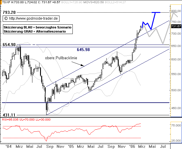Tendenziell dürfte es weiter in Richtung einer langfristigen Barriere gehen, die zunächst als Mindestziel für die kommenden Monate auszumachen ist (siehe Seite 3 der Analyse). Da der Markt kurzfristig aber anhaltend übergekauft ist, steht zunächst eine recht steile, seit dem 8. Februar etablierte Aufwärtstrendlinie unter verstärkter Beobachtung, die momentan bei etwa 728 Punkten verläuft.