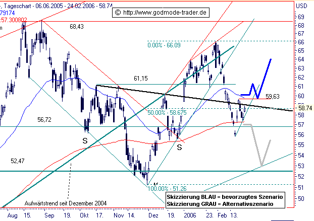 Rohölpreis der Nordseesorte Brent: 58,74 $ (Endloskontraktdarstellung) Aktueller Tageschart (log) seit 12.04.2005 (1 Kerze = 1 Tag) Diagnose: Der Ölpreis Brent brach im Dezember über eine bullische Triggerlinie (schwarz) bei 59,20 $ nach oben aus, das dabei generierte Kaufsignal führte den Kursverlauf bis 66,09 $ bevor es in den Vorwochen wieder zu einem deutlichen Rückfall kam. Im Bereich der bei 56,72 $ liegenden Unterstützung konnte sich der Ölpreis Brent nach dem Rückfall der Vorwochen wieder fangen. Verstärkt wird diese Unterstützung durch die exp.GDL 200 (rot) bei 57,30 $. Nach dem Rückfall ausgehend von 66,09 $ läuft bisher aber nur ein Abbau des technisch kurzfristig überverkauften Zustands. Der Rückfall unter die Triggerlinie (schwarz) muss negativ gewertet werden. Ölpreis Brent: Kurfristige Stabilisierung