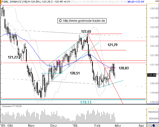 Bund Future: 121,46 Punkte Maßgeblicher richtungweisender Future für den deutschen Rentenmarkt im adjustierten Endloskontrakt. Aktueller Tageschart (log) seit 21.09.2005 (1 Kerze = 1 Tag) Kurz-Kommentierung: Der BUND Future brach vorgestern über den Widerstandsbereich bei 120,83/87 aus und fiel gestern mit einer langen schwarzen Kerze deutlich darunter zurück. Heute pendelt der Futur relativ volatil um seinen Vortagesschluss. Damit befindet sich der Future in einer schwierigen Lage. Theoretisch könnte der Future nun doch noch bis 119,13/20 Punkte abfallen, aber im Moment könnte der Rückfall auch nur ein extrem überschießender Pullback sein. Ein Klärung der Situation wird es aber wohl erst im Laufe der nächsten Woche geben. |