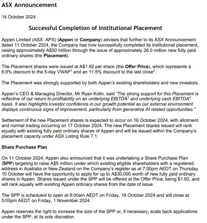 Appen führt eine vollständig garantierte institutionelle Platzierung durch, um etwa 50 Millionen australische Dollar