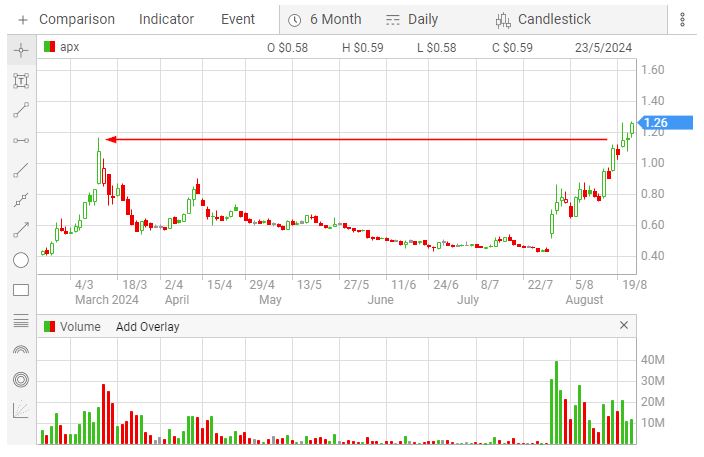 Dieser Intraday-Höchststand war ein großer Sprung gegenüber dem gestrigen Schlusskurs der Appen-Aktie von 83 Cent.