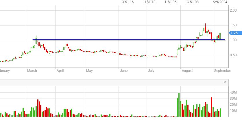 Es ist auch das erste Mal seit Oktober letzten Jahres, dass die Aktie über 1 US-Dollar gehandelt wird.