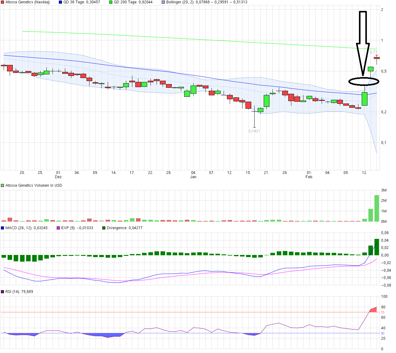 Richtig spannend aus Aktionärssicht sind auch die jüngsten Ausführungen von Finanzchef Kyle Guse, der im Conference Call die feste Überzeugung eines Kurs-Comebacks zum Ausdruck brachte. So antwortete Guse auf eine Analystenfrage, wie man auf das ab Ende März drohende Nasdaq-Delisting aufgrund des niedrigen Kursniveaus reagieren wolle: «Unser Plan ist tatsächlich unser Geschäft auszuführen und zur passenden Zeit gute News zu veröffentlichen. Wir denken, die fundamentale Entwicklung des Geschäfts wird den Aktionärswert steigern und den Aktienpreis zurück über 1$ treiben.» Das Wort Re-Split nimmt Guse dabei erst gar nicht in den Mund. Man ist geneigt zu glauben, dass Atossa es wirklich schaffen könnte, bis März wieder sein Pennystock-Dasein abgelegt zu haben, schließlich sind Börsenwert und Freefloat gering, die Story stark und das Orderbuch dünn. Auch Cash ist noch bis mindestens ins zweite Quartal 2016 vorhanden. Im Juni hatte Atossa noch einige Millionen Dollar bei Healthcare-Investoren zum Preis von 1,15 Dollar je Aktie eingesammelt. Mit Aspire Capital steht außerdem ein Fonds bereit, der zur Not unter die Arme greift. Riesige Kurssprünge gab es in der Vergangenheit entsprechend öfters: Fast exakt vor einem Jahr, zwischen dem 16. und 26. Dezember 2014, knallte die Atossa-Aktie von 0,90 auf 2,10 Dollar in die Höhe….