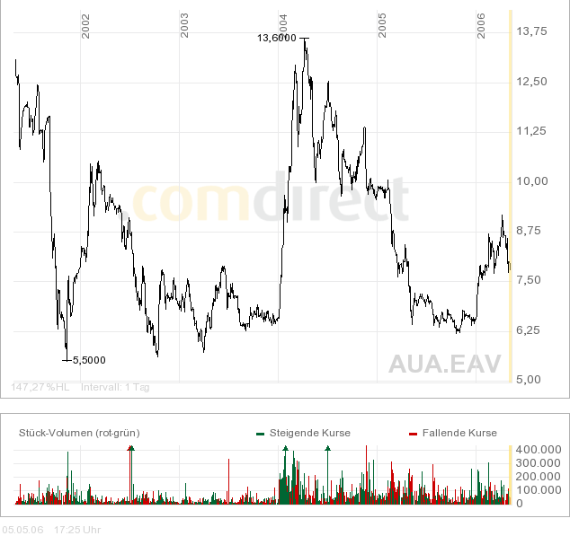 Ulrich Horstmann von der Bayern LB halte einen Kaufpreis von bis zu 7 Euro pro Aktie für möglich, was ein ordentlicher Aufschlag wäre. Heute Mittag notierte die AUA-Aktie bei 4,50 Euro. Mit einem Kaufpreis von 602 Mio. Euro wäre es die nach Air France-KLM im Jahr 2003 zweitteuerste Übernahme in der europäischen Luftfahrtgeschichte." ...