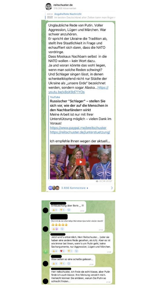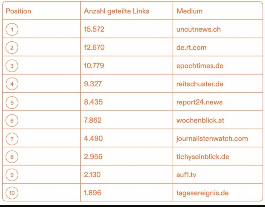 Von den 100 meistgeschauten Videos von RT DE enthielten 67 Videos einen Bezug zu Covid-19. Eine Studie der CeMAS zur Bundestagswahl 2021 zeigte, dass RT auf Platz 2 der meistgeteilten Links in der verschwörungsideologischen Szene ist. Über seine Webseite brachte RT DE weiter Putins Propaganda zu den Pandemie-Leugner:innen.