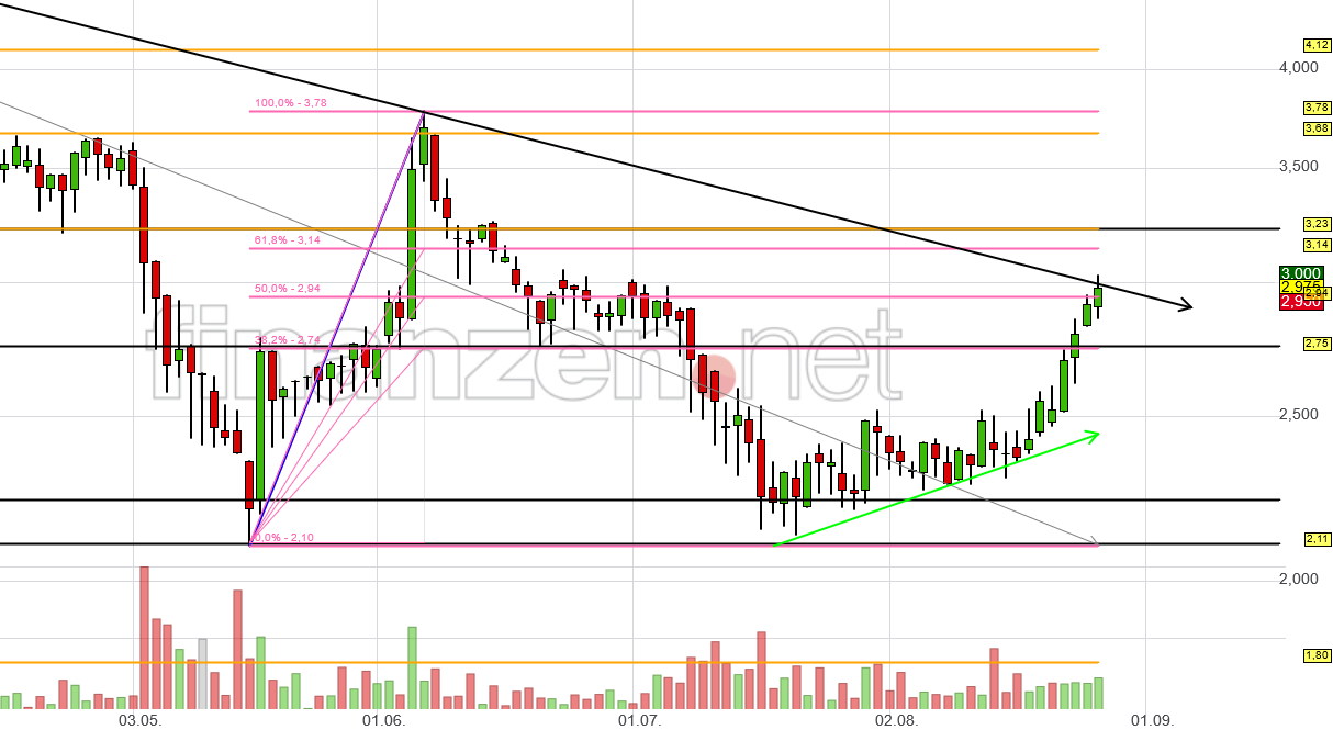 PS Jetzt nicht zu positiv sehen. Ich hatte ursprüngli­ch eine kleinere Korrektur um die 2,94 erwartet. Dass das jetzt doch so stark läuft hat mich schon überrascht­. Noch dazu, dass der Kurs kurz vor dem Ausbruch aus dem fallenden Trenkanal steht.