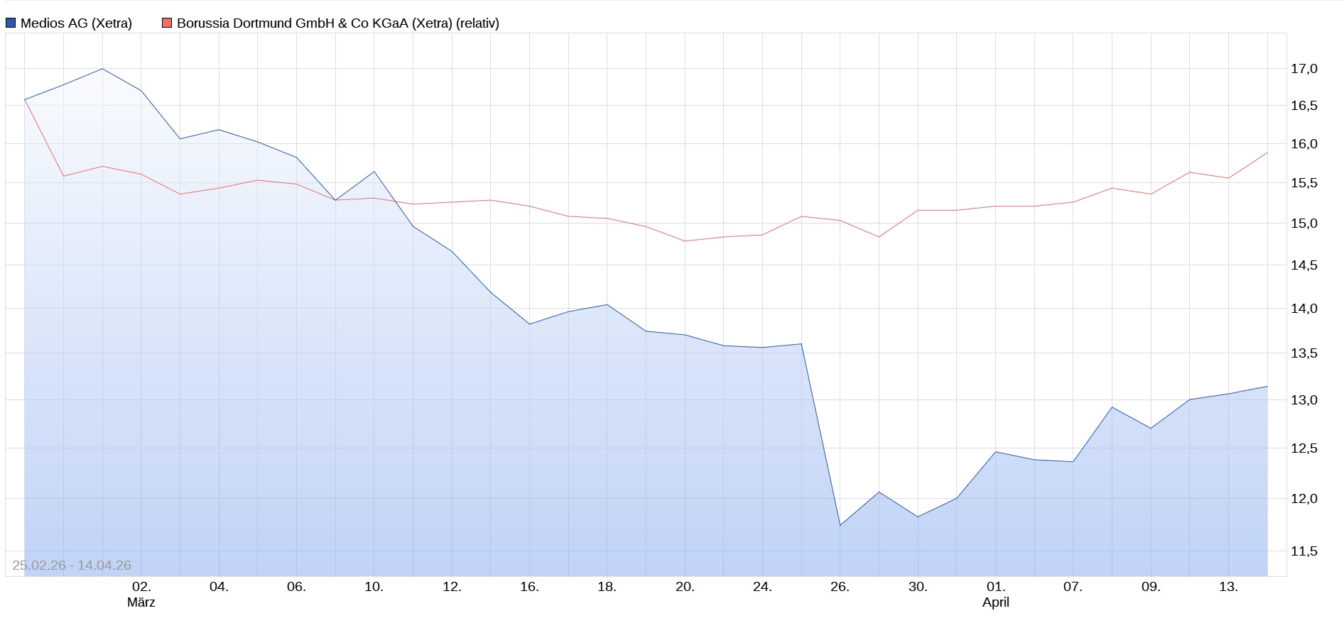 Hier sieht man die extrem unterschie­dliche Kursperfor­mance beider Aktien nach der Gewinnwarn­ung von BVB am 26.2. Die extrem enttäuscht­e Reaktion der Märkte auf die Zahlen von Medios am 26.3. ist da auch enthalten.­