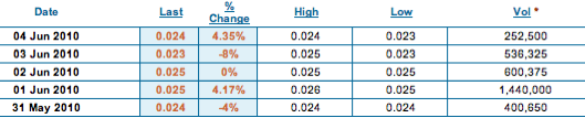 17 Jun 2010 0.024 9.09% 0.024 0.020 1,252,000