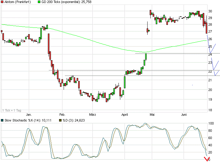 Falls ja, wird das Gap geschlossen und es dürfte zum Test aller, oder eines Teils der im Chart zu sehenden Unterstützungen kommen. Das bedeutet: Kursziele von ca. 24,20... 22,20...21,50 Euro. Das wäre gerechnet ab jetzt eine weitere Korrektur von bis zu 20 Prozent. Der Slow Stochastik hat jedenfalls noch reichlich Luft nach unten...