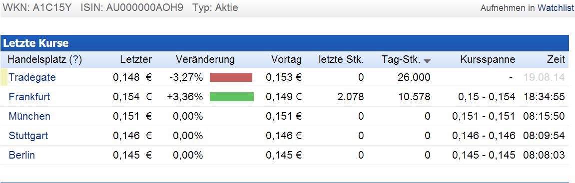 Was bleibt, ist eine kleine australische Explorationsfirma in einem Wert von 3-4 Cent pro Aktie, und ich frag mich auch, ob das bedeutet, dass die Aktie beim Handel in Deutschland die Liquidität einbüßt.