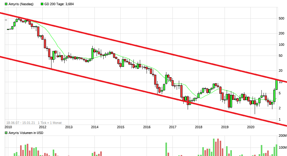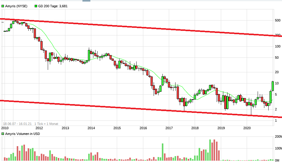 ... solche überlegungen sind naheliegend, wenn man davon ausgeht, dass der von dir eingezeichnete große trendkanal nach unten bestand hat. Was aber, wenn das nicht der Fall ist - also wenn amyris über die rote linie geht, die du da eingezeichnet hast. ich könnte mir vorstellen (vorstellen!), dass wir den großen ausbruch, der seit jahren überfällig ist in diesem moment erleben ... und der erste ernsthafte stop erst wieder bei 30 Dollar +x am start ist - denn amyris mit 10 Mrd bewertet ist - das wäre ein etwa zehnfaches von GEVO - die mit 10 Mio dollar umsatz im vergleichbaren Segment mit 1 Mrd Dollar bewertet sind - dann wären die Bewertungsverhältnisse noch nicht zurechtgerückt - aber etwas korrigiert - aber wie gesagt: habe keine glaskugel und kann deine entscheidung daher gut nachvollziehen - verkaufen muss man auch lernen ...