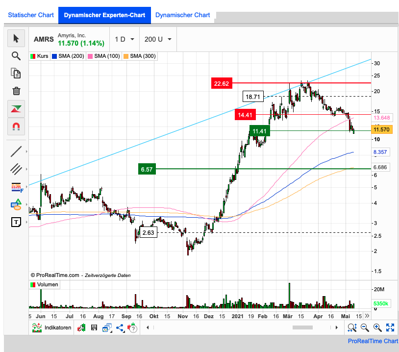 Ich hoffe es kommen bald mehr positive Posts/Nachrichten. Was ist eigentlich mit unseren Propheten "DerHexer" :). Er postet sonst immer was, wenn Neuigkeiten über Amyris gibt. Manchmal habe ich die Tage, "komm verkauf Amyris und schau nach was anderes um." Ich hoffe es bleibt bei seitwärts Bewegung , aber Nasdaq will nicht hoch. Ich glaube die 11,40 $ hält diese Woche nicht, dann werden die supports 10,50 $, 9,20$. 8,40$ und zum Schluss 6,60 $ getestet. Okay, bin grad wieder pessimistisch drauf :D