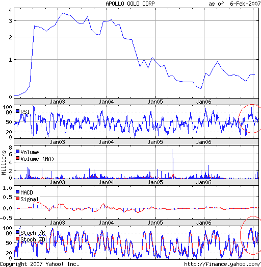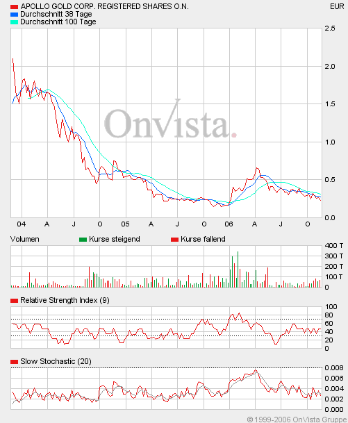 Aber bei Apollo gefällt mir, dass sie innerhalb eines Trendkanals relative wenig Volatilität zeigt. Und es ist ein Produzent, zwar noch nicht rentabel, aber du kannst dir ja überlegen, wie das Ergebnis aussähe, wenn der Goldpreis 10-20 % steigt. Zudem sind die Modernisierungsmaßnahmen der Mine(n) großteils 2006 abgeschlossen, d.h. das Ergebniss sollte ohnehin deutlich besser werden.
