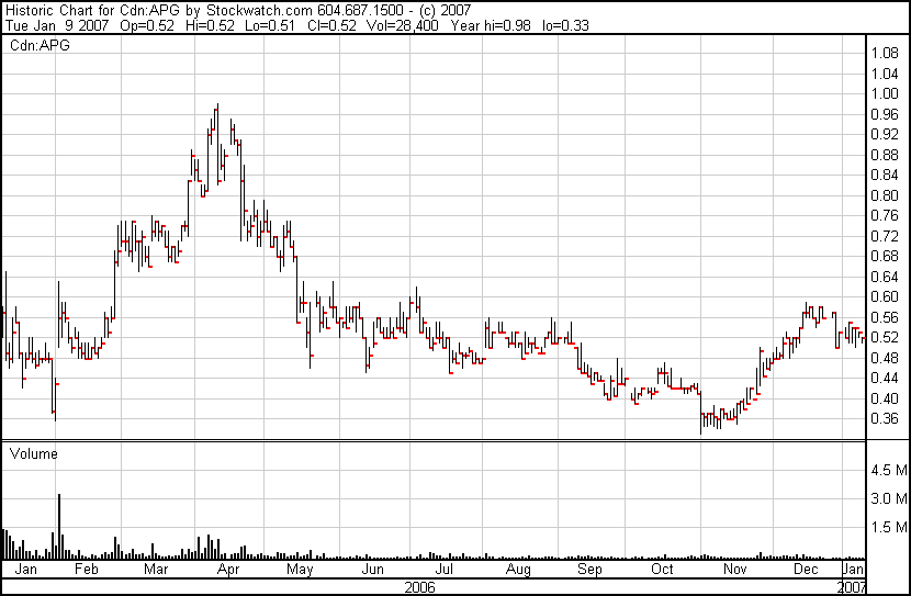 As previously announced in Stockwatch on Aug. 1, 2006, Apollo entered into a joint venture with Elkhorn Tunnels LLC, an affiliate of Calim Private Equity LLC, in respect of the company's Montana Tunnels mine. The joint venture agreement calls for Elkhorn to earn up to a 50-per-cent interest in the mine by contributing $13-million over a five-month period, with money being contributed on a weekly basis. As of Dec. 31, 2006, Elkhorn had contributed $9.27-million, and as of Jan. 4, 2007, this contribution had risen to a total of $11.0-million.
