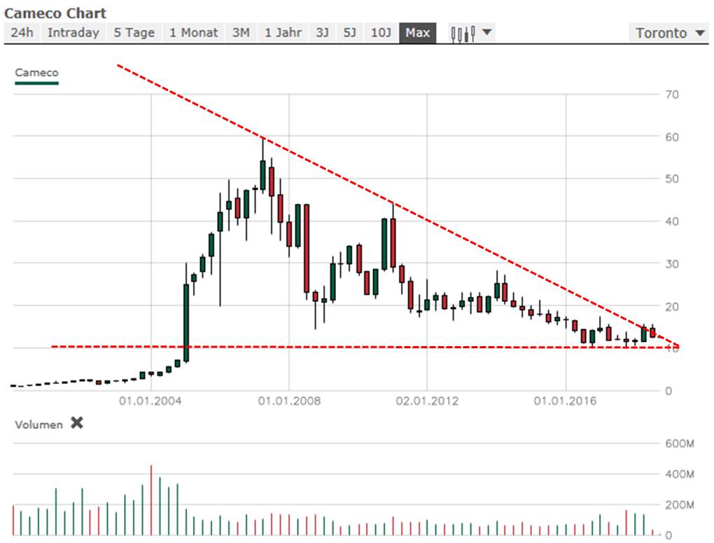 Kurzfristig glaube ich nicht! Warum? Weil Cameco langjährige Abnahmeverträge mit höheren Preisen als der Spot-Markt die letzten Jahre hergegeben hat, abgeschlossen hatte. 60% laufen hier über diese Verträge. Nur 40% über Spot-´Markt. Jetzt laufen die Verträge langsam aus und Cameco bekommt ein Problem, da sie die Verträge erneuern müssen und zwar zu niederigeren Preisen. Es sei denn Cameco entscheidet sich für 100% Spot-Markt. Kann ich mir nicht vorstellen, da der Ladenextrem konservativ agiert. Langzeit-Chart liest sich spannend aber ich rechne hier weiterhin mit fallenden Kursen bis 10 CAN. Nächste Haltelinien aktuell bei 12,38 und 11,54