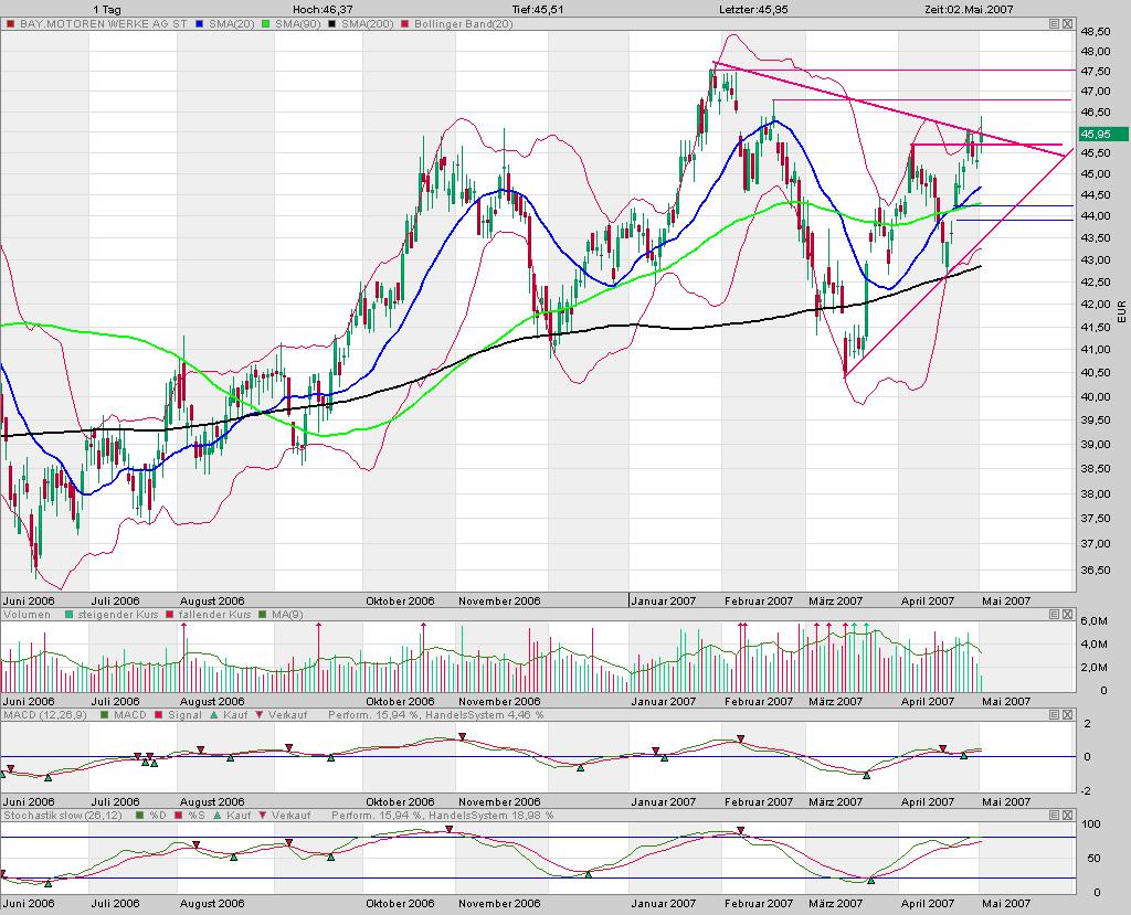 Im Zuge dieser Bewegung bildete sich ein symmetrisches Dreieck, das im unteren Schaubild eingezeichnet ist. Die Kurse sind schon recht weit in die Spitze der Formation vorgedrungen, ein Ausbruch ist schon bald zwingend. Derzeit kitzelt die Notierung an der oberen Begrenzungslinie und steht unmittelbar vor dem Ausbruch. Bricht die Aktie signifikant aus dem Dreieck aus, wovon bei Kursen ab 50 Euro gesprochen werden kann, liegt ein neues Kaufsignal vor. Dann sollte BMW auch zügig auf ein neues Hoch klettern.