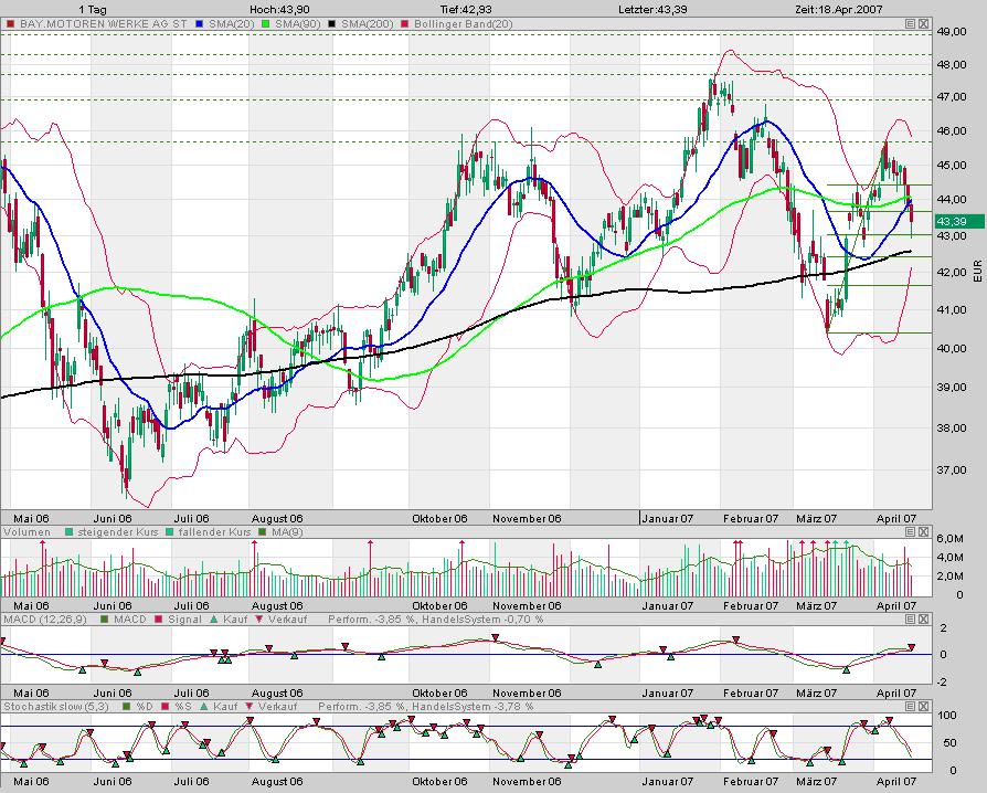 Nach einem neuen Höchststand bei 47,52 EUR nähert sich das Papier jetzt wieder dem beweglichen Durchschnitt über 50 Tage von 44,22 EUR: das Kursverhalten auf diesem Level könnte eine mittelfristige Weiterverfolgung der Bewegungen interessant machen. Die ersten Kaufsignale (oder kurzfristige Unterstützungslinien) liegen bei 42,44 EUR und 41,54 EUR. Die Widerstandslinien liegen bei 47,84 EUR und 48,74 EUR.
