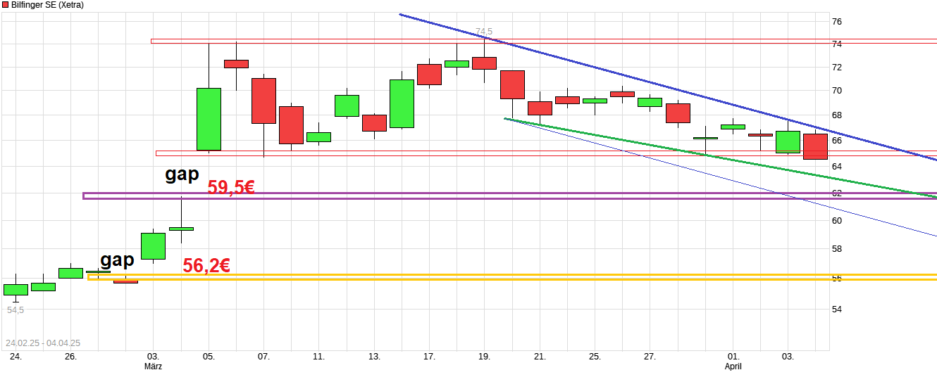 Nachdem man Anfang März den großen Hüpfer nach oben machte aufgrund der guten Zahlen und guten 25er Prognose, scheint man jetzt von der Gesamtmarktkorrektur mit nach unten gezogen zu werden. Da kommt man jetzt dem Gap von Anfang März bei 59,5€ immer näher. Denke das wird auch noch geschlossen in den kommenden Tage. Bleibt die Frage wie tief der Gesamtmarkt noch runter will und ob dann auch das Gap bei 56,2€ noch ein Anlaufpunkt werden könnte. So wie ich die Aussagen des Vorstandes verstanden habe von Anfang März, wäre Bilfinger durch US Zölle nicht betroffen.