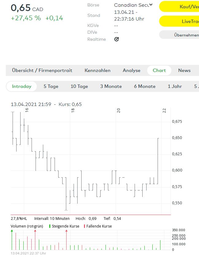 Alles, was hier vor- oder nachbörslich passiert, egal ob rauf oder runter, sollte nicht überbewertet werden. Schlusskurs in CAN war 0,65 CAD