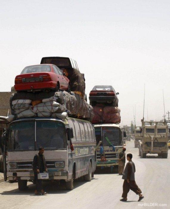 das Gepäck ist ordentlich verschnürt, die Autos aber sind nur aufgesetzt. Ein einziges Seil an der Felge kann man erahnen, beim ersten Bremsmanöver liegt das Blech auf der Strasse. Über 5 Meter Höhe und 3 Tonnen Schwerpunkt ganz oben ...