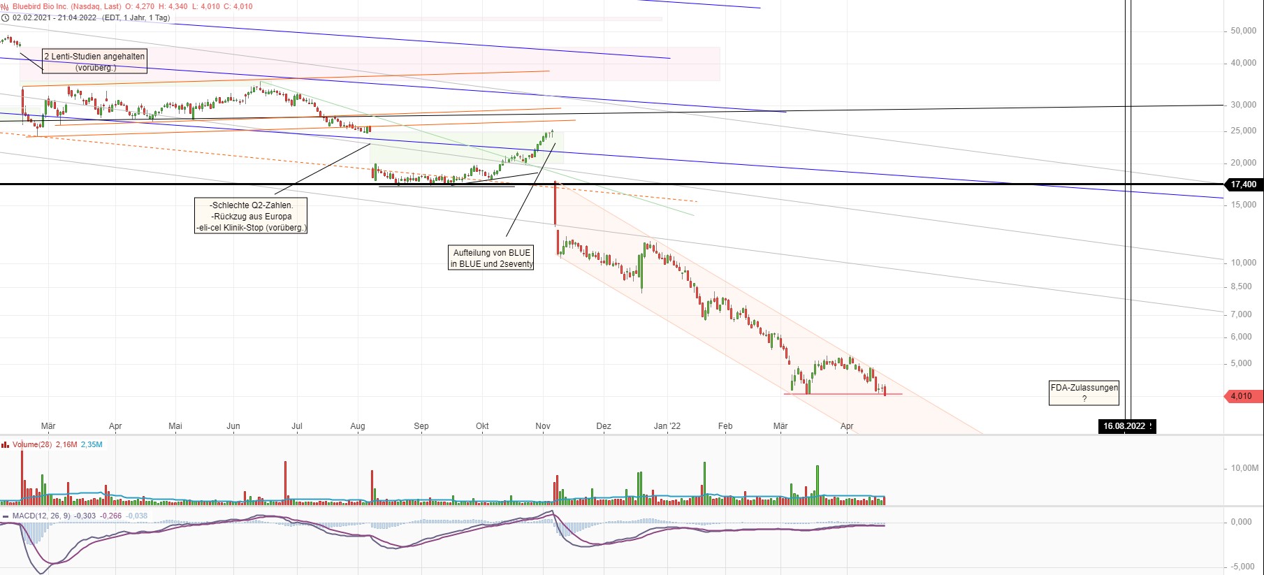 BLUE 6.81$ (neues 52 WT) MK 477 Mio. $, damit wird bluebird aktuell knapp über seinem Cashbestan­d von 447 Mio. $ vom 31/12/21 bewertet.