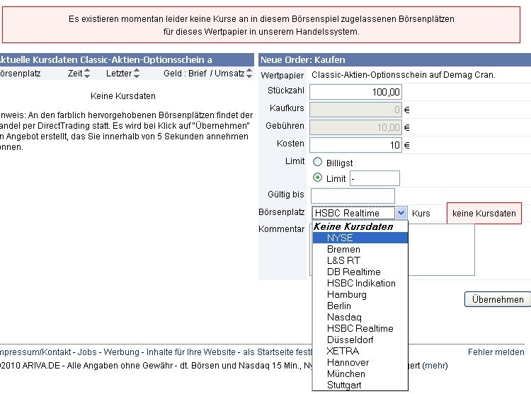 Die trotz der Warnung angezeigten Börsenplätze allerdings werden noch entfernt werden, so dass nicht wie hier der Eindruck entsteht, es könnte trotz der Meldung doch etwas ausgewählt werden. Es handelt sich um Standardbörsenplätze, die in Transaktionsdepots eingeblendet werden, wenn keine Kursdaten vorliegen. Im Börsenspiel iritiert diese Anzeige dagegen eher.