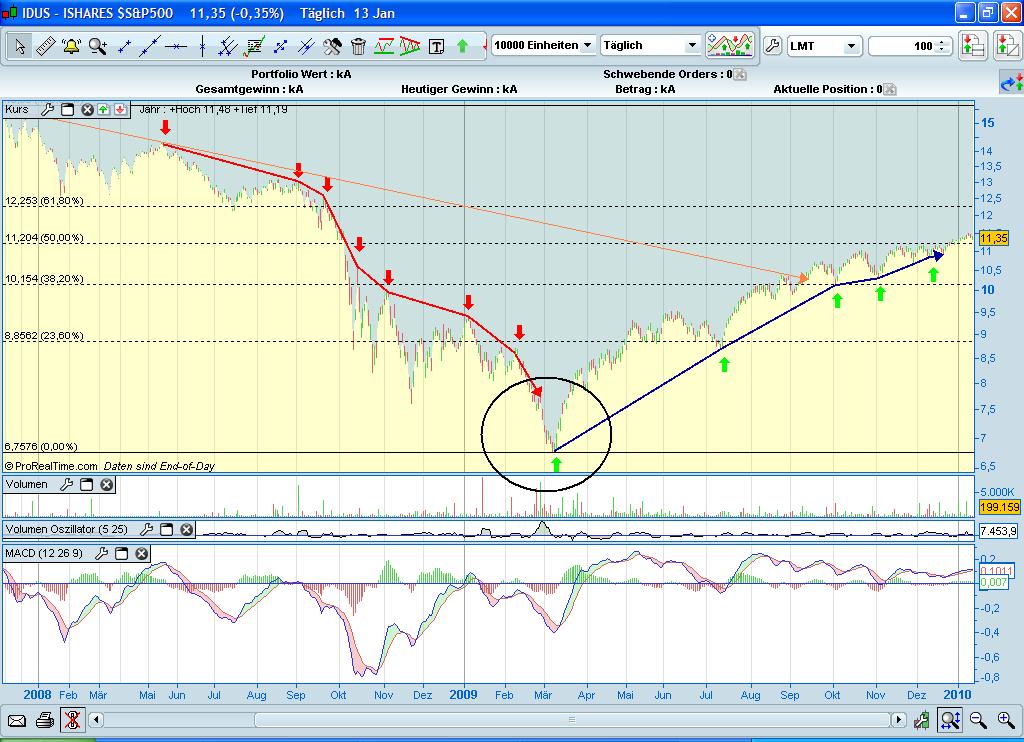 Eine der sichersten Methoden Trends zu analysieren liegt in der Analyse der absoluten Tief - bzw. absoluten Hochpunkte­ einer Bewegung - hier am Beispiel des S&P500 (sehr breit aufgestell­ter Index) - seit Beginn dieser Finanzkris­e bzw. den ersten Kursrutsch­ bis hin zur "Wende" im März folgten konstant abfallende­ Hochpunkte­ - das Hoch einer jeden mittelfr. Bewegung lag unterhalb des davorigen - man verbindet diese Hochs und erhält einen Trend - in diesem Fall einen Abwärtstre­nd. Seit März genau andersheru­m - die Tiefpunkte­ im Index auf mittelfr. Sicht liegen immer oberhalb der davorigen.­ So kommt man zum Aufstellen­ eines Musters, welchem der Markt folgt bzw. welches den Trend sehr genau angibt. Interessan­t ist hierbei die Komninatio­n mit MACD/Aroon­ zur Untermauer­ung dieser These - des weiteren das Beobachten­ wie sich übergeordn­ete Trendlinie­n, wie der im Dezember letzten Jahres gebrochene­ übergeordn­ete Aufwärtstr­end, verhalten.­.. dieses Muster funktionie­rt im übrigen auch intraday, insofern der Timeframe (Zeiteinhe­it) nicht zu gering gewählt ist - aufwärts 30 Min Chart. Wichtig bzw. entscheide­nt hierbei ist nur der Candleclos­e, nicht aber die Bewegung im Docht über diesen Zeitraum.