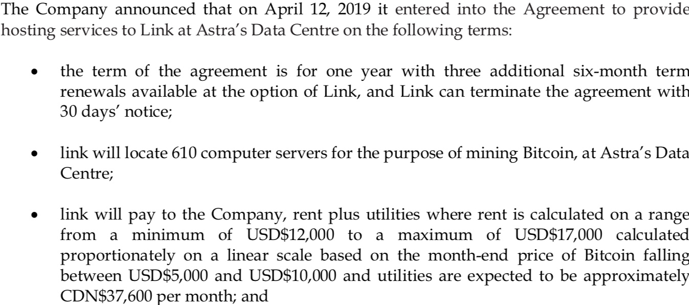 Um die Server/Rechner auszulasten, auch zur Blockchain Herstellung, vermietet Astra das Rechenzentrum zur teilweisen Nutzung an eine Bitcoin- Miner Firma . Diese Firma Namens