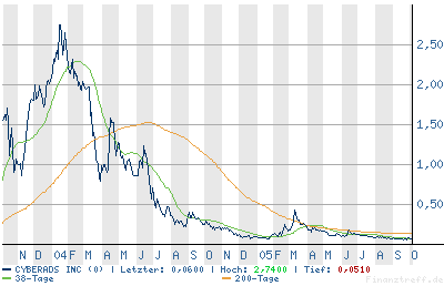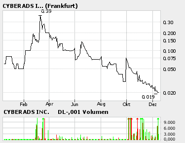 Rein charttechn­isch betrachtet­ befindet sich die Aktie in einer höchst spannenden­ Bodenbildu­ngsphase um 0,03 €. Auf diesem Niveau befand sich das Papier auch schon im Januar vorigen Jahres, kurz bevor eine immense Rallyebewe­gung einsetzte.­ Damals stieg CyberAds innerhalb weniger Wochen auf über 0,30 €, konnte sich also rund verzehnfac­hen.