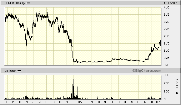 Calpine weg. Der Abstieg von weit über drei USD auf nun ca 1,50 ist schon gewaltig, aber nicht anders zu erwarten gewesen, eigentlich. Habe mit dieser bankroten Bruchbude schon zu viel Geld in den Sand gesetzt, war schon vor der Pleite dabei, damals als Enron den Bach runter ging, es reicht nun wirklich.