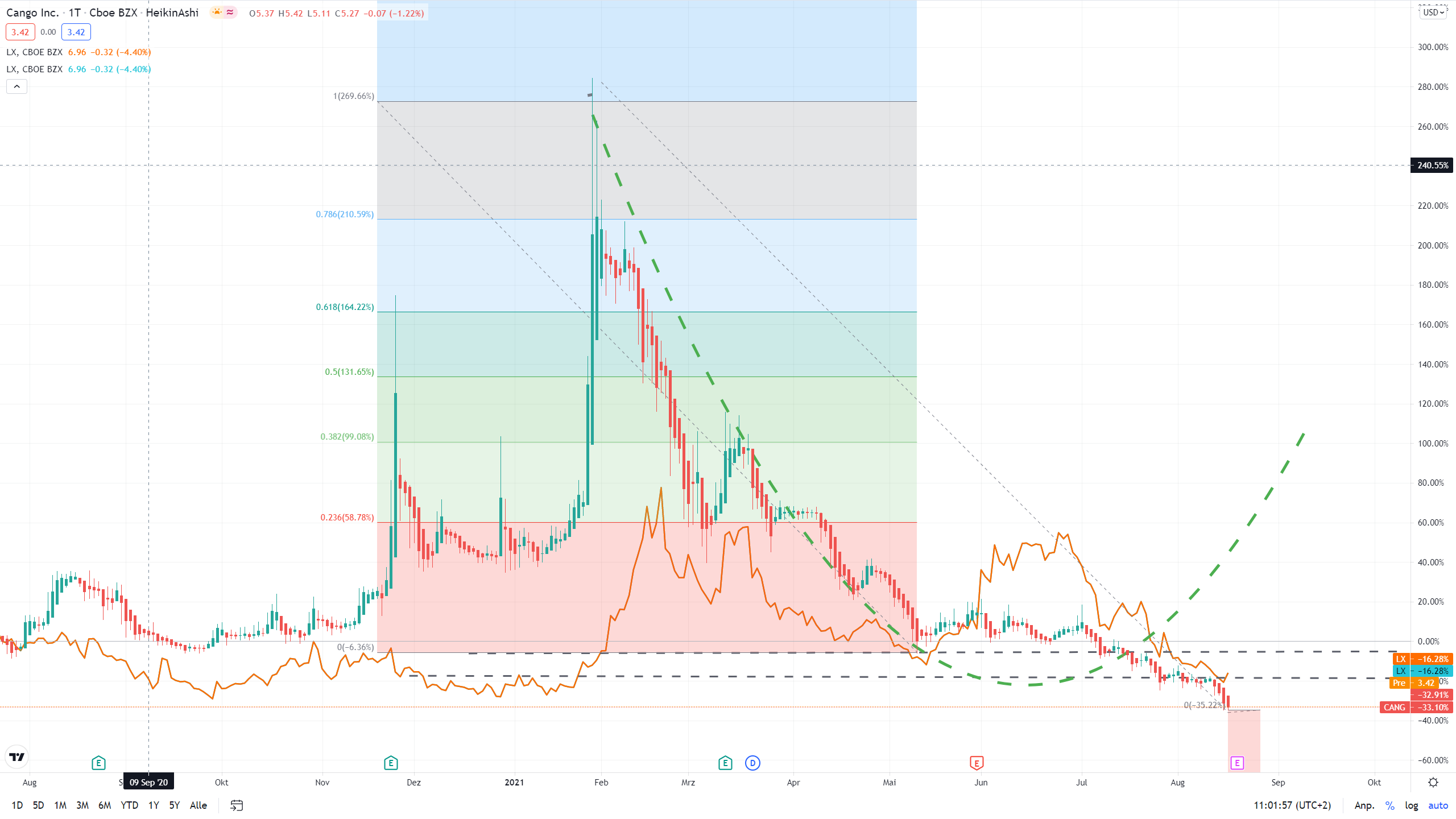 Nachfolgend der Chart (mit den alten, angewandten Tools) im Verhältnis zu Lexinfintech. 360 Digitech (nicht im Bild) hat ähnliche Beulen und Knicke im Chart, kommt aber insgesamt besser weg.