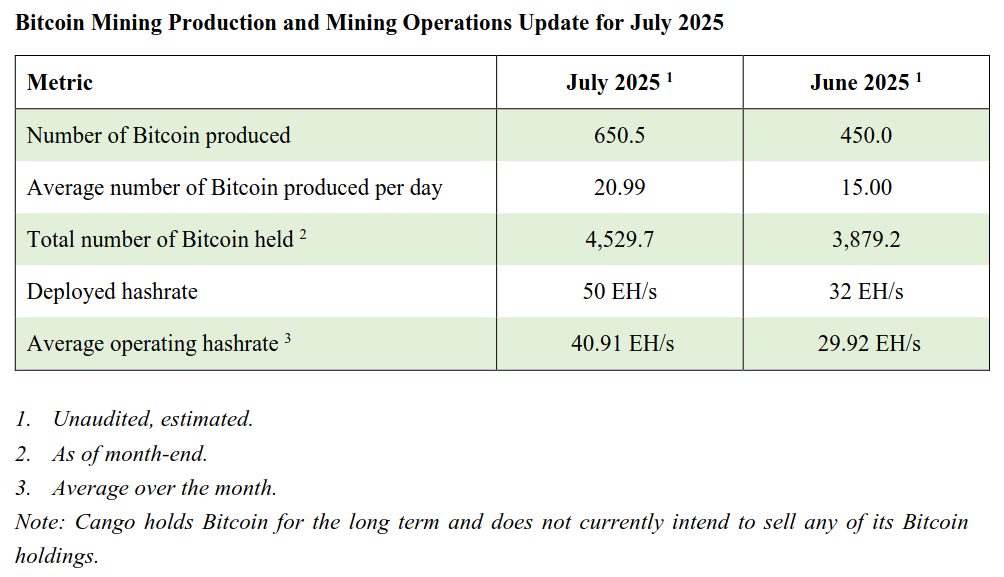 "The company also announced that it has completed the previously announced acquisitions of on-rack crypto mining machines with an aggregate hashrate of 18 Exahash per second on June 27, 2025. The acquisition now brings Cango's total hashrate to 50 EH/s."