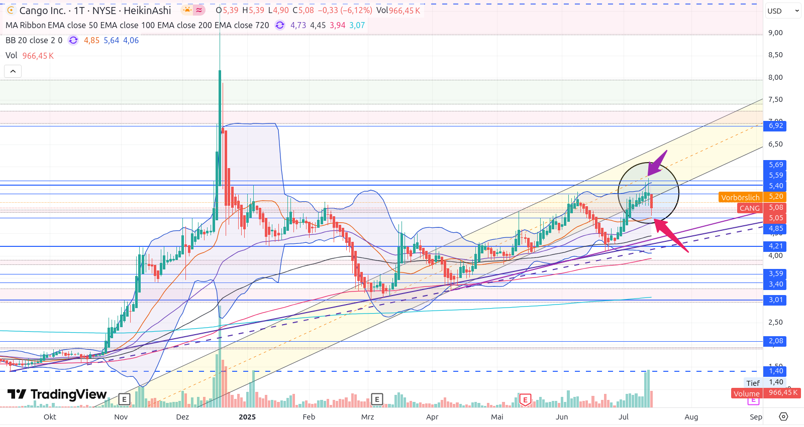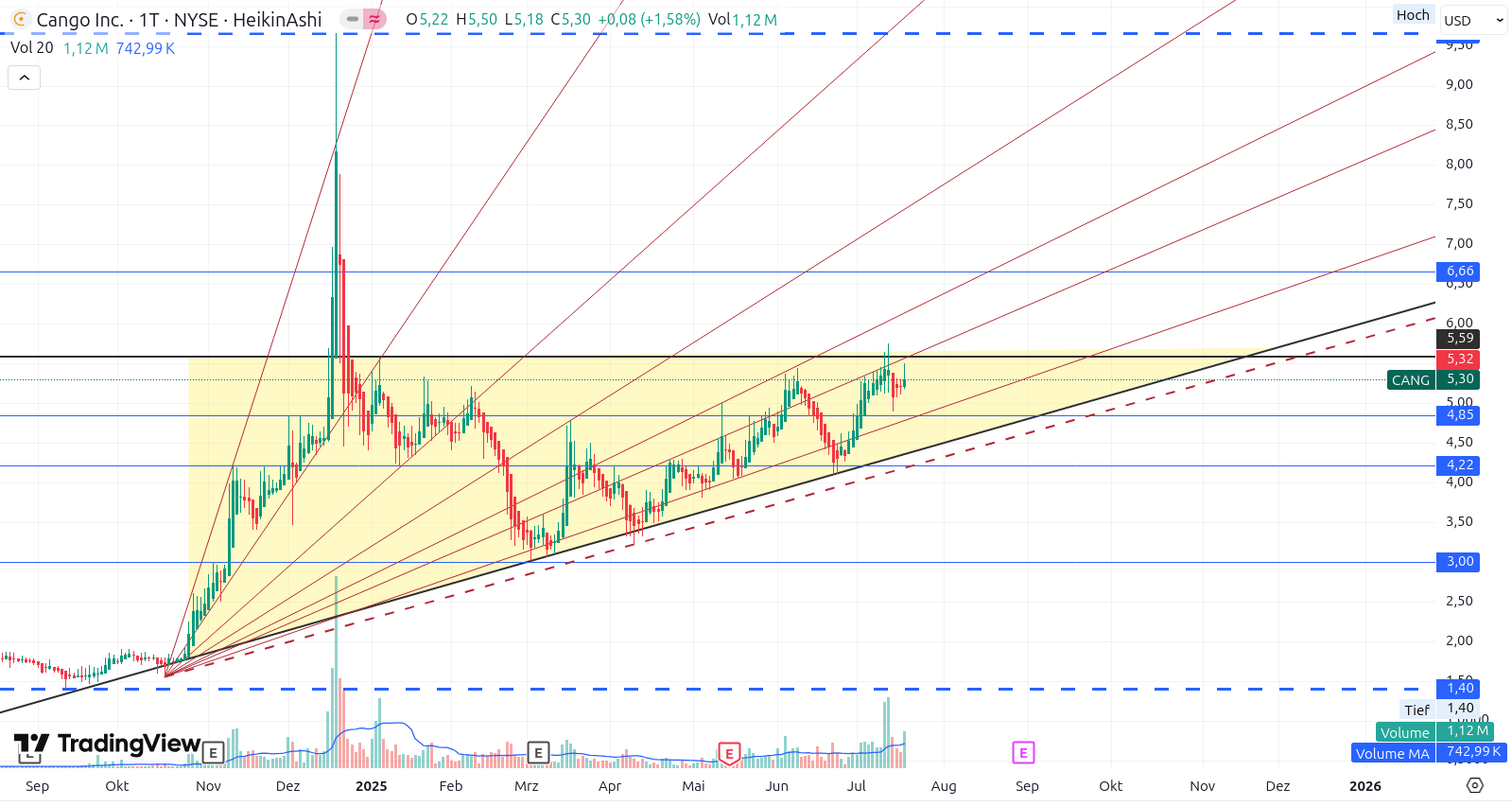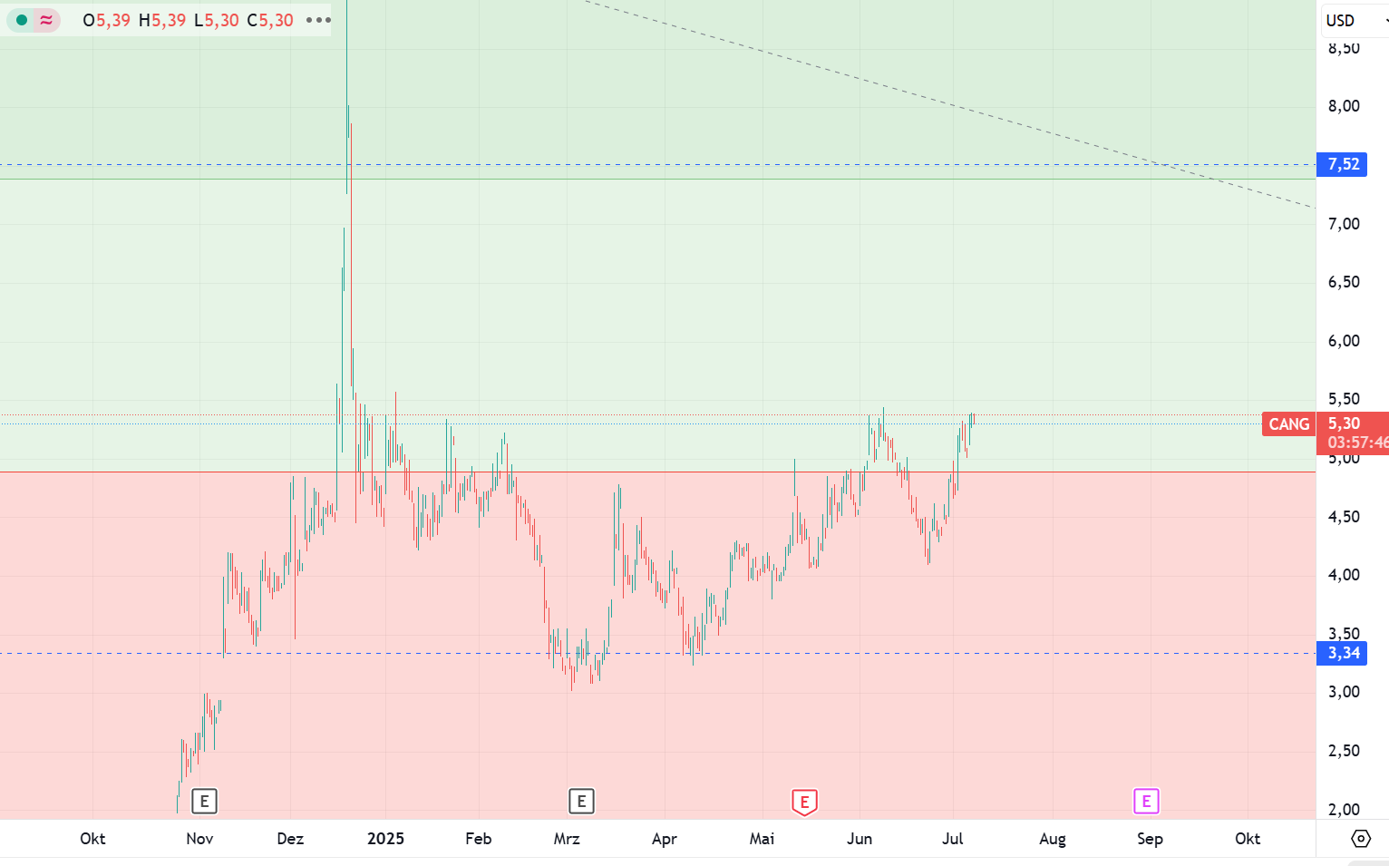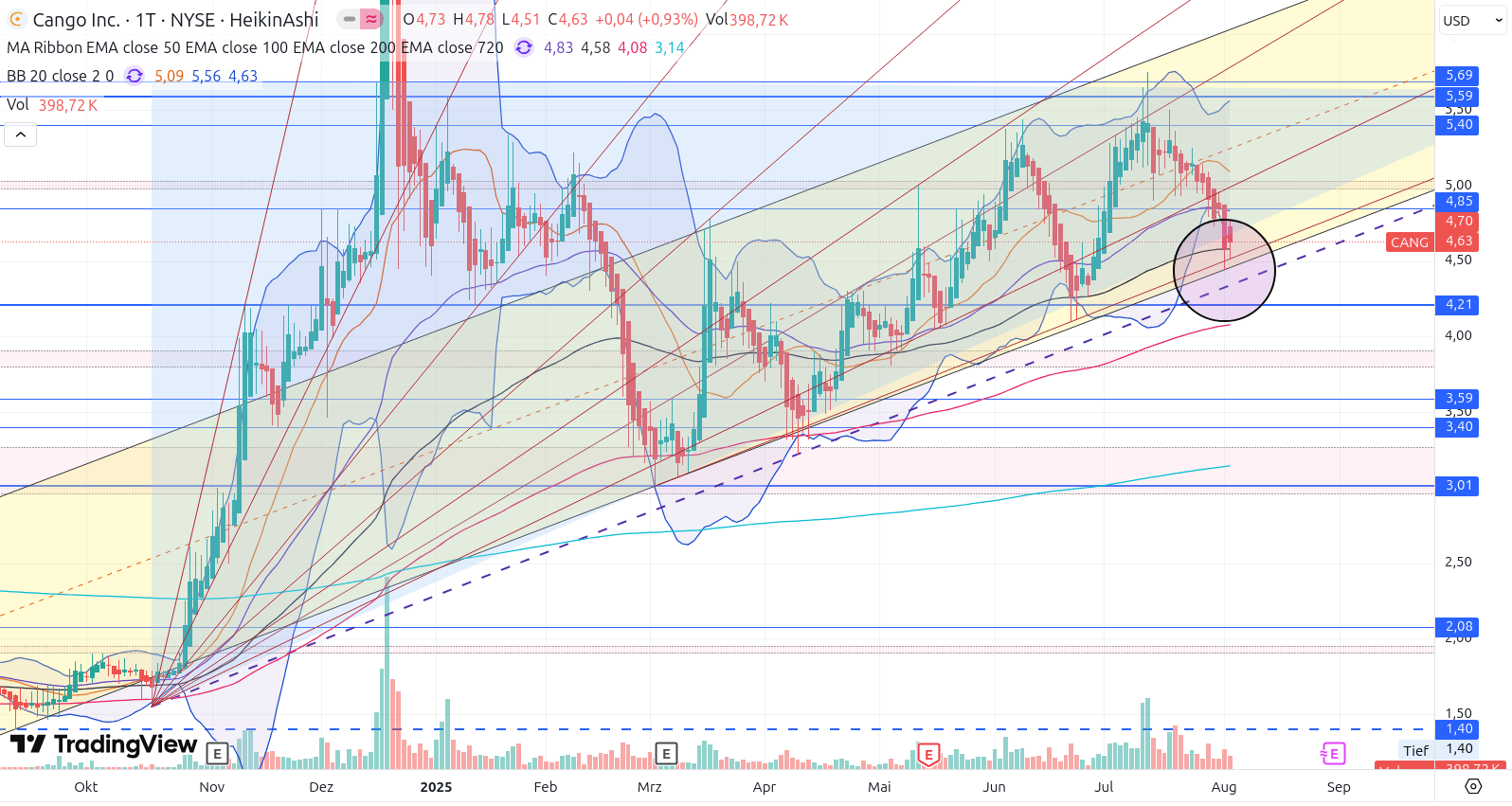 Theoretisch könnte Cango bereits an der 4,85-USD-Unterstützung (roter
