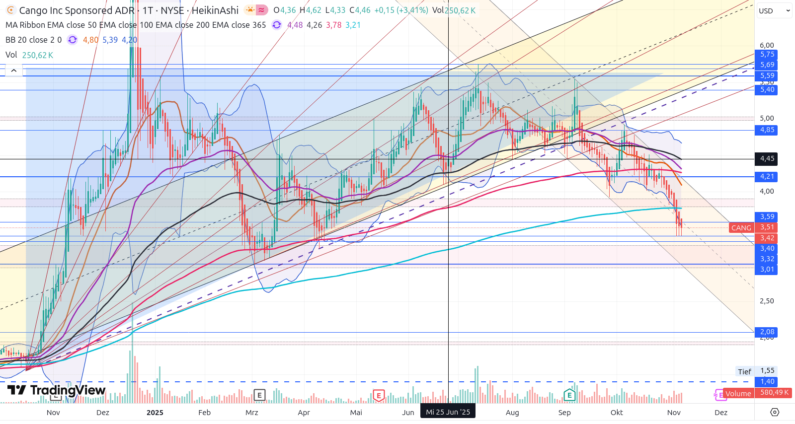 Mit Momentum durchbrach Cango ferner den EMA 365 (grün).