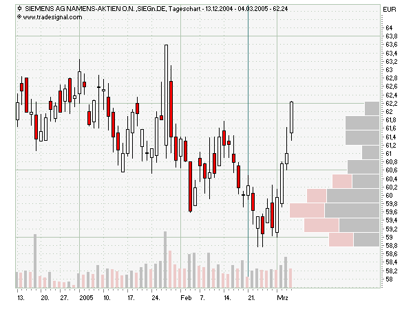 Die Farben der Balken zeigen wie hoch der Anteil des Volumens von steigenden bzw. sinkenden Preisen herrührt. Ein Balken in einer Preishöhe von z.B. 30 – 35 € , der zu 90% hellrot ist, zeigt, dass das kumulierte Volumen für den Preis 30 zu 90% bei fallenden Preisen entstanden ist.