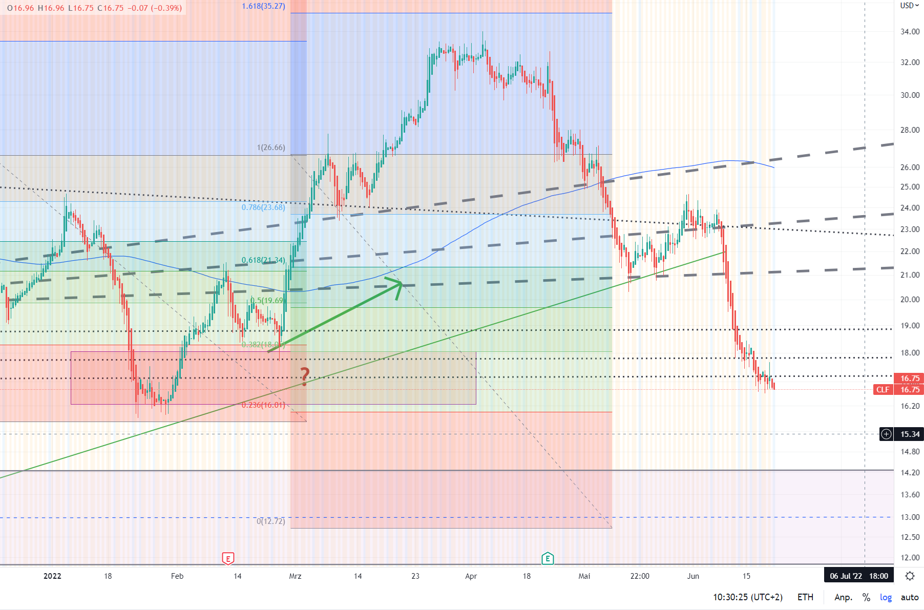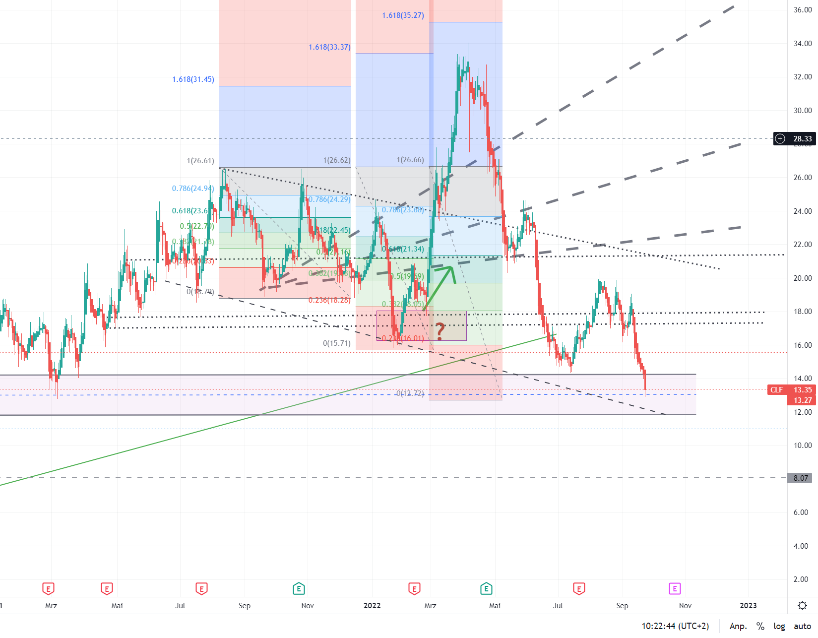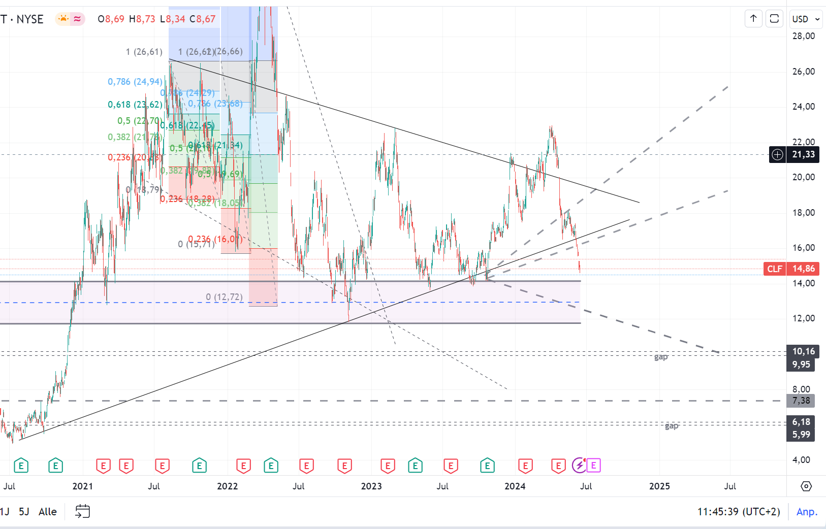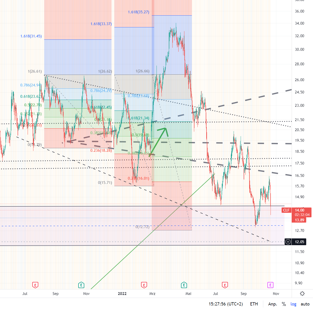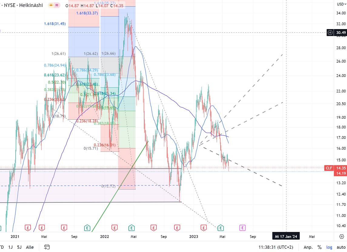 Kursziellinien aktualisiert. Kurs ist gestern auf dem niedrigen Target angekommen. Wir haben hier zwar nicht das Thyssenkruppproblem, aber die Herausforderungen und die Investitionen in den grünen Umbau werden nicht hinreichend präzise kommuniziert. CLF manövriert zwischen weiteren Übernahmen, Buybacks und immer wieder dünner werdender Kapitaldecke hin und her. Ein Erwachen der Analysten, die beiden Enden der Kursziele wurden nachgeschärft.