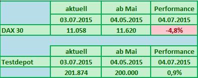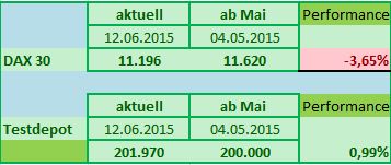 Der DAX verlor seit dem 04.05.2015 immerhin 3,64%, das Testdepot hingegen verzeichnet im gleichen Zeitraum ein Plus von 1,02%.