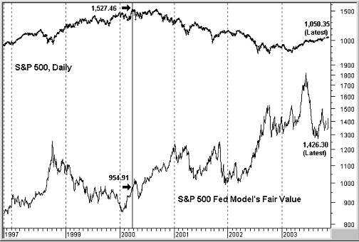 The Fed model as of November 14, 2003, despite a major rally off February 2003 lows, had the S&P 500 still well below fair value. You can seen in Figure 1 that the Fed Model shows the S&P fair value at 1,426.30, despite a rally of close to 30% from its 2003 lows to the latest level of 1050.35. In other words, the S&P 500 is still 26% below fair value, or undervalued by 376 points, as indicted in Figure 2.
