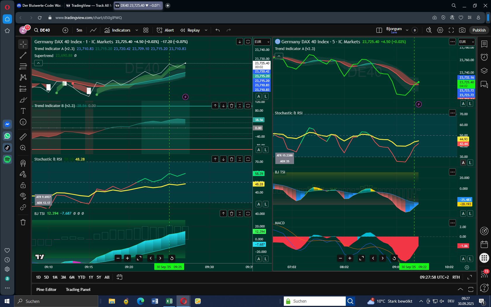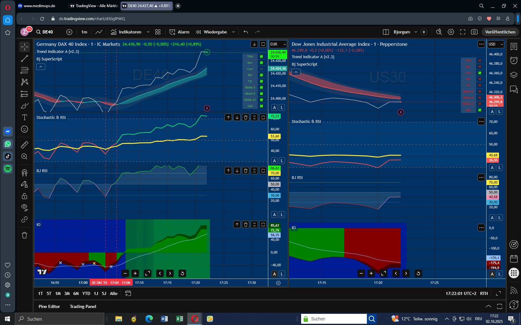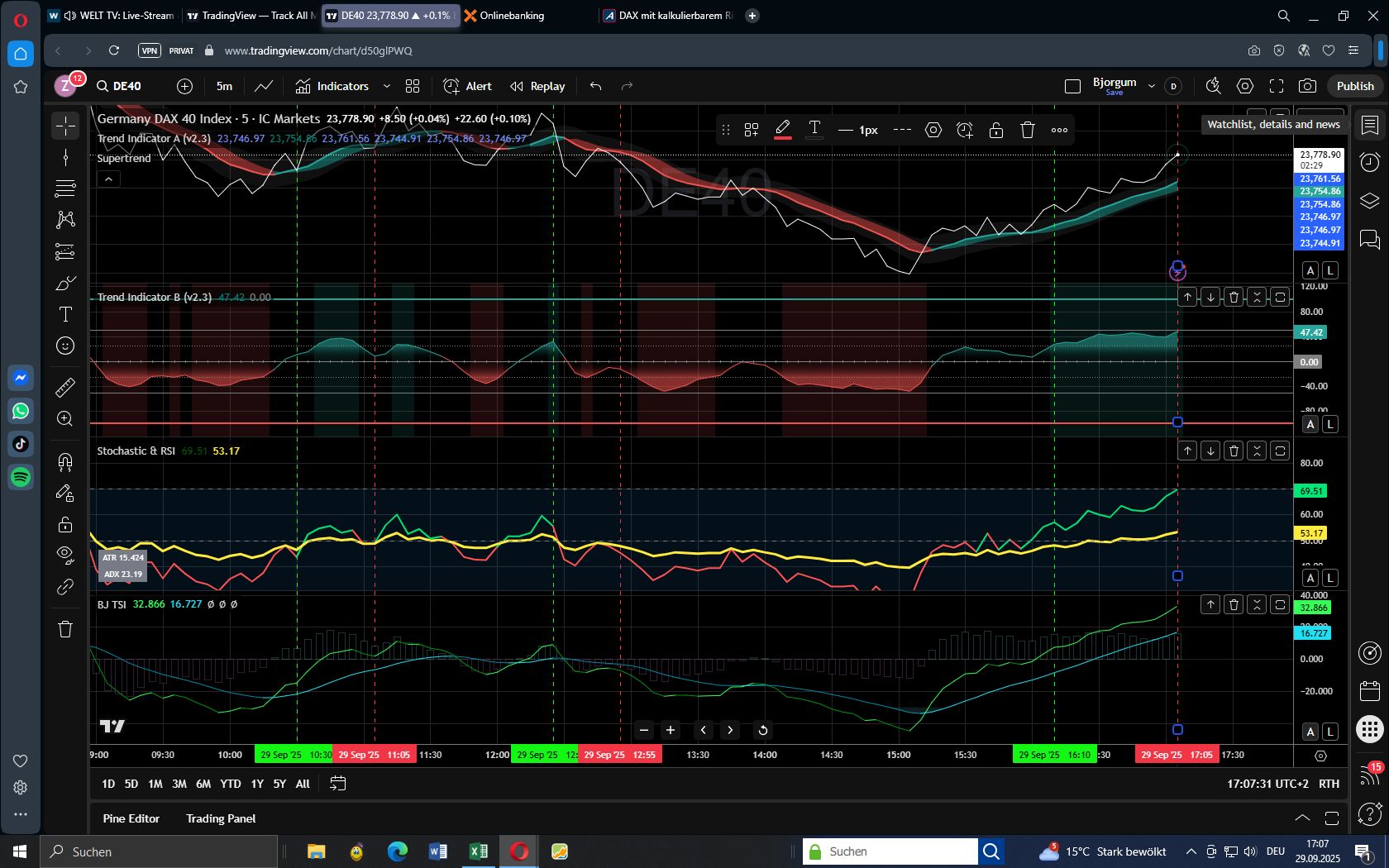 Seit 07:00 Uhr beginnt ein downtrend. DAX liegt unter der Trend Indicator Linie – wird bestätigt von RSI, dessen Linie wird ebenfalls von oben nach unten bei 50 durchbrochen – ferner bestätigt vom Machine Learning Momentum Oscillator. Tendenz: Der downtrend wird sich weiter fortsetzen, wie der kleine Progrnos-Pfeil zeigt. Wundern tut´s nicht - nach dem fulminanten DAX-Anstieg in dieser Woche.