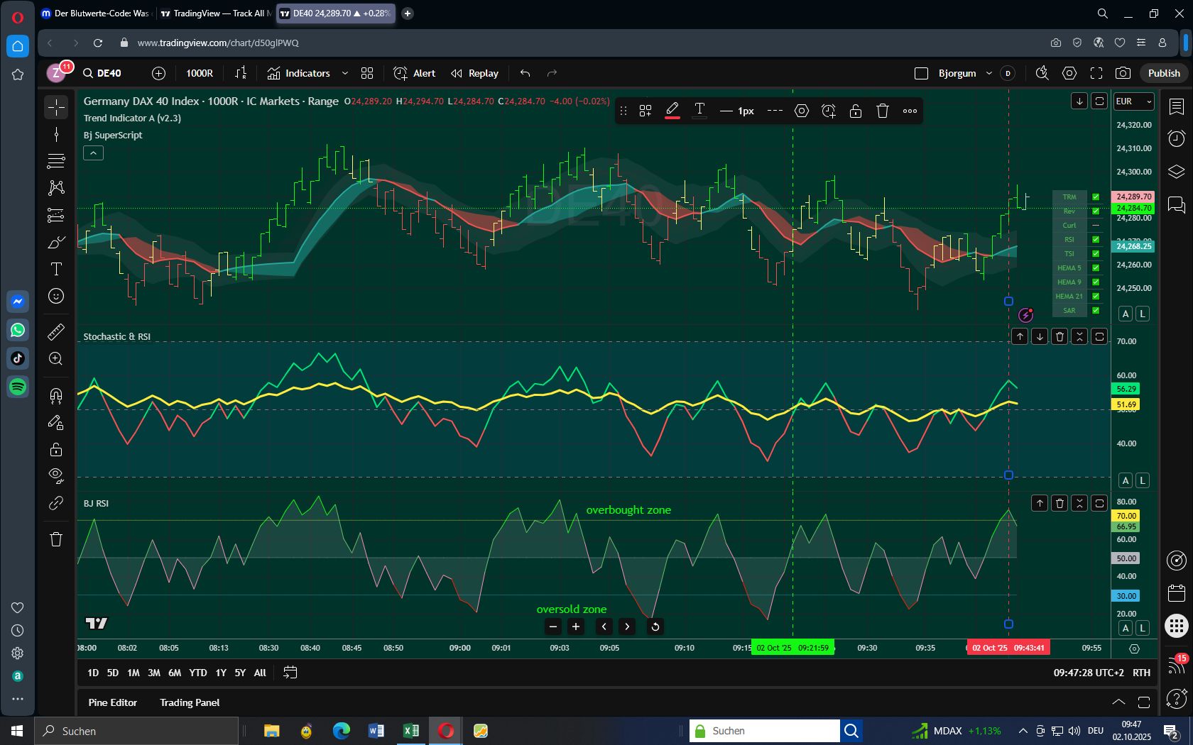 Verwendet wird das Börsenchart-Programm tradingview und die in diesem Programm hinterlegten Indikatoren Bj SuperScript, Volumen Profile + Pivot Levels. BJ TSI und BJ RSI.