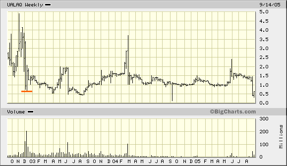 Als Referenz der Chart von United Airlines, die im Dez. 2002 unter Chapter 11 ging. Die Aktie fiel da auf 0,60 Dollar (unten, rot), erholte sich dann aber im Jan. 03 deutlich auf 1,50 Dollar. Im Mai 2004 schoss sogar einmal auf 3,70 Dollar hoch. Wer bei 0,60 short gegangen war, hatte da schon über 500 Prozent Verlust! Jetzt, 3 Jahre später, können sich die Shorts gerade mal für 0,50 eindecken - mit 0,10 Dollar Mini-Gewinn. Dafür mussten sie 3 Jahre zittern und hatten zwischendurch horrende Buchverluste.